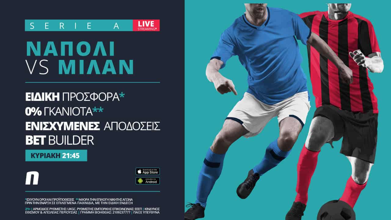 Το ιταλικό ντέρμπι προβάλλεται σε Live Streaming*, παίζει με σούπερ προσφορά*, ειδικά στοιχήματα και ενισχυμένες αποδόσεις. Στη Novibet γράφεις τη δική σου ιστορία και στο Νάπολι – Μίλαν!