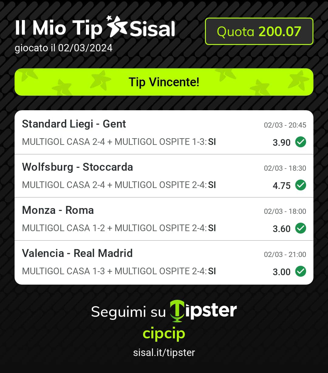 Τι έχουμε εδώ; Εύρος τερμάτων κάθε ομάδας και όχι όλου του αγώνα! Τι εννοούμε; Πάρτε για παράδειγμα το Μόντσα – Ρόμα. Ο τύπος, έβλεπε γκολ στο ματς. Γκολ και από τις δύο, με πιθανότερους νικητές τους «τζιαλορόσι». Έπαιξε λοιπόν, τη Μόντσα να βάλει από ένα έως δύο γκολ και τη Ρόμα από δύο έως τέσσερα. Τελικό σκορ, 1-4.
