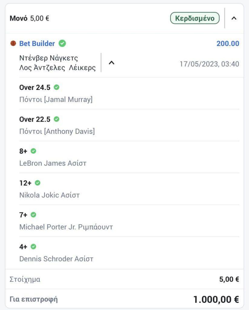Jamal Murray με over 24,5 πόντους, Anthony Davis με over 22,5 πόντους, Lebron James με 8+ ασίστ, Nikola Jokic με 12+ ασίστ, Dennis Schroder με 4+ ασίστ και Michael Porter Jr. με 7+ ριμπάουντ.