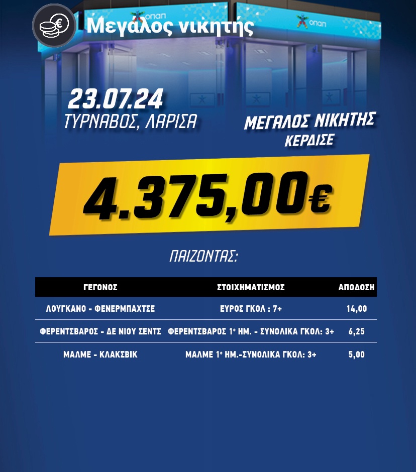 Μεγάλο μπαμ στις 23 Ιουλίου στον Τύρναβο, με παικταρά να βγάζει 4-5 μισθούς με μια τριάδα!
