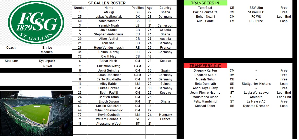 Μπορούσε πέρσι περισσότερα η Sankt Gallen FC αλλά κατάφερε απλά να τερματίσει 8η στο πρωτάθλημα. Πλήρωσε την συμμετοχή της στην League Phase του Conference League καθώς τα πολλά συνεχόμενα ματς την έκαναν να μην μπορεί να τα διαχειριστεί και στα δύσκολα ματς του πρωταθλήματος δεν πήρε τα αποτελέσματα που ήθελε. Πάντως συνεχίζει να είναι και τώρα μια άκρως επιθετική ομάδα υπό τις οδηγίες του Γερμανού κόουτς Enrico Maaßen ο οποίος συνεχίζει για 2η χρονιά στον πάγκο της. Μεταγραφικά δείχνει για την ώρα αποδυναμωμένη, επιθετικά κυρίως καθώς έχασε πολλούς επιθετικούς και δεν τους αντικατέστησε μένοντας μόνο με δύο στο δυναμικό της. Απέκτησε 4 παίκτες με την μεταγραφή του μέσου Boukhalfa από το πρωτάθλημα της Budesliga να ξεχωρίζει. Αντίθετα, πολύ σημαντικές ήταν οι αποχωρήσεις των Akolo και Mambimbi. Παραμένει δύναμη μεγάλη ο κόσμος της που κάνει συνέχεια sold out στα εντός έδρας παιχνίδια της.
