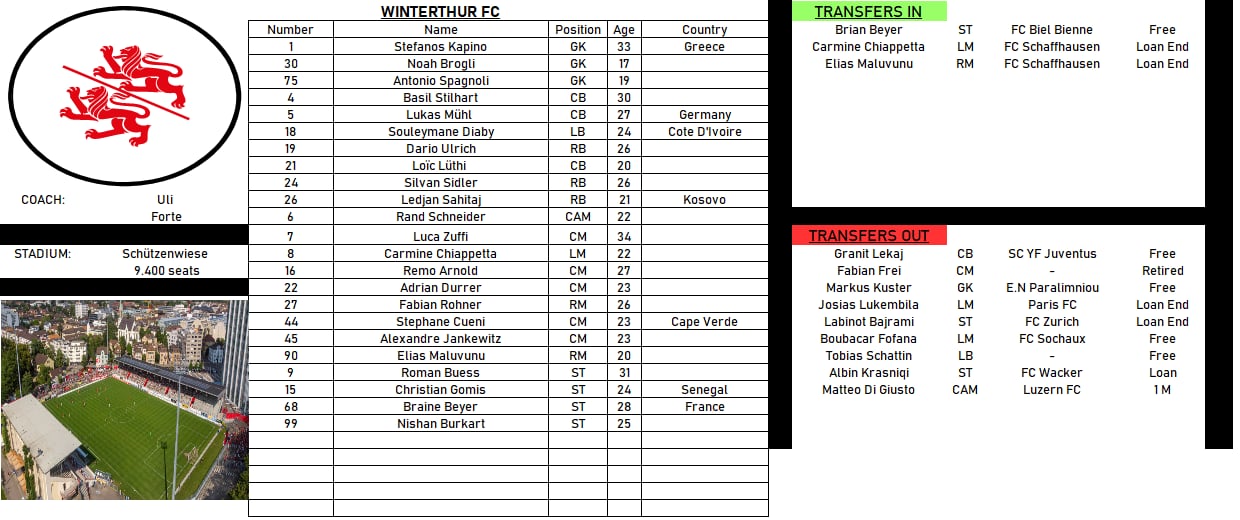 Η ομάδα της Winterthur FC τερμάτισε στην 10η θέση πέρσι αλλά είναι ευχαριστημένη καθώς ήταν απόλυτο φαβορί για υποβιβασμό για πολλούς μήνες και στην τελευταία θέση, όμως από την άνοιξη και μετά κατάφερε και με πολλές νίκες έμεινε στην κατηγορία αποφεύγοντας κιόλας και τα μπαράζ παραμονής. Σημαντικός ο ερχομός του Ιταλού κόουτς Uli Forte που έδωσε ελπίδα στην ομάδα και με τις έξυπνες επιλογές του στην σύνθεση της ομάδας, της πρόσφερε ενέργεια που της έλειπε. Μετά από αυτά ο Forte συνεχίζει στον πάγκο της όμως θα έχει όπως φαίνεται πιο δύσκολο έργο φέτος καθώς έχασε 9 παίκτες που έφυγαν, κάποιοι βασικοί και κυρίως ο Di Giusto που τα τελευταία χρόνια ήταν σημαντικό κομμάτι στην επίθεση της. 3 παίκτες ήρθαν, οι δύο πίσω από δανεισμούς ενώ αποκτήθηκε ο έμπειρος Γάλλος φορ Beyer. Το ρόστερ της χρίζει άμεσης ενίσχυσης αν θέλει να αποφύγει τα περσινά και να μην πάει για χειρότερα καθώς υπάρχουν λίγες ποιοτικές επιλογές και ίσως είναι και φαβορί για υποβιβασμό τώρα με βάση αυτά τα δεδομένα.