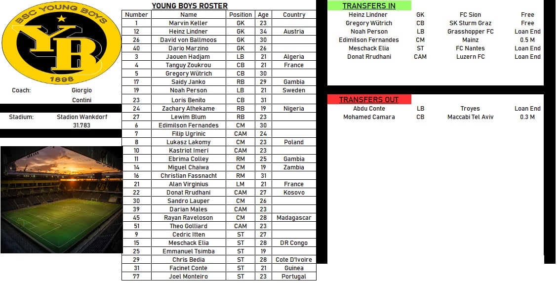 Η περσινή σεζόν ήταν απόλυτα αποτυχημένη για την ομάδα της Βέρνης η οποία έπεσε από τον θρόνο της, τερμάτισε στην 3η θέση και γενικά έδειξε πολύ μέτρια ως κακή πολλές φορές εικόνα. Μάλιστα, είχε βρεθεί για καιρό νωρίς στο περσινό πρωτάθλημα στην τελευταία θέση. Αυτό άλλαξε με τον ερχομό του Giorgio Contini ο οποίος την ανέλαβε το φθινόπωρο και συνεχίζει και σήμερα και έφερε ηρεμία στην ομάδα και σταδιακά την ανέβασε. Την άνοιξη κατάφερε και έκανε αντεπίθεση και σκαρφάλωσε από την μέση της βαθμολογίας στην 3η θέση και έτσι κάπως κράτησε τα προσχήματα. Φέτος έκανε λίγες προσθήκες στο δυναμικό της με κορυφαίες αυτές των Fernandes και Wutrich. Αποχώρησαν προς το παρόν δύο παίκτες αλλά επέστρεψαν και 3 δανεικοί από πέρσι και με έτσι δείχνει πιο δυνατή καθώς κράτησε τον περσινό κορμό της. Ζητούμενο η σταθερότητα καθώς έχει το ρόστερ για να πετύχει τους στόχους της σε Ελβετία και Ευρώπη.