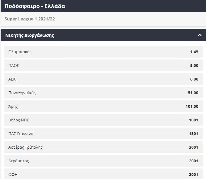 Δείτε αναλυτικά τον πίνακα με τις αποδόσεις για την κατάκτηση του φετινού πρωταθλήματος εδώ: