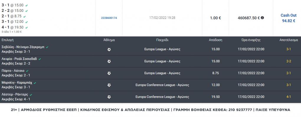 Ωστόσο, κατά τη διάρκεια του 2ου ημιχρόνου των αγώνων (άρχιζαν όλα στις 22:00) αποφάσισε να κάνει Cash Out στα 94,82€.