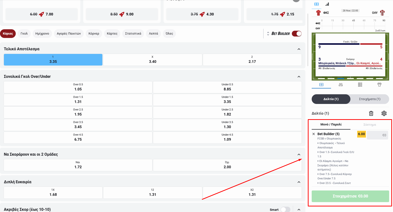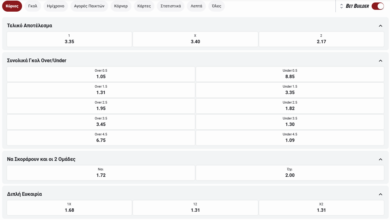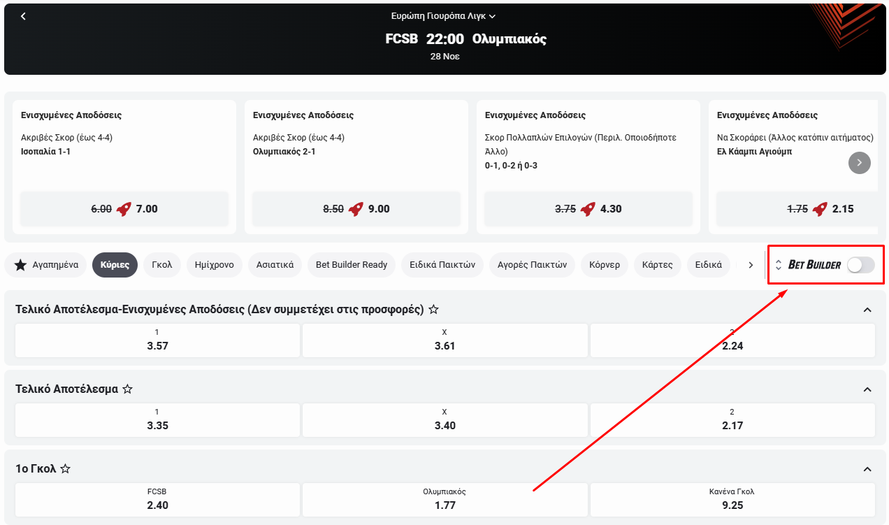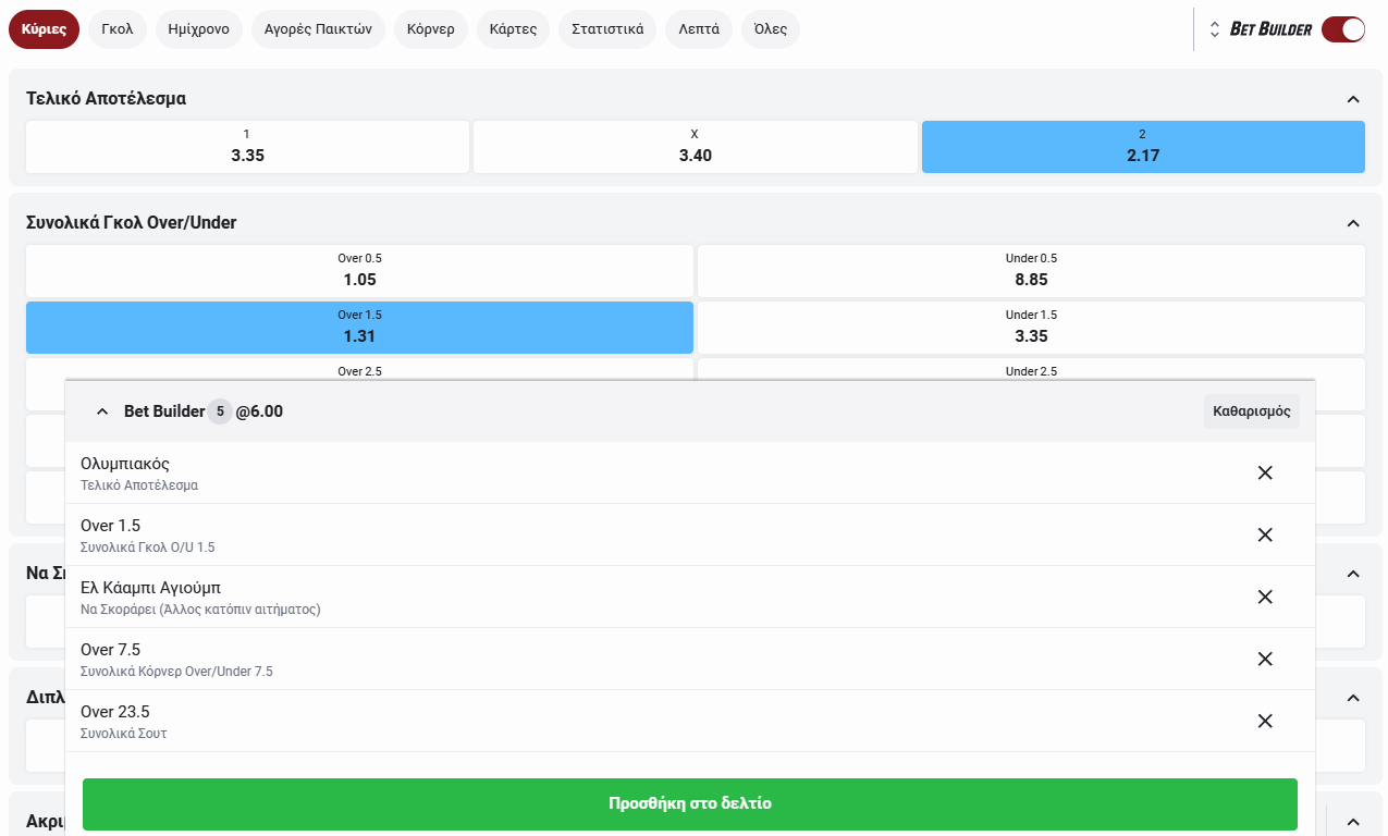 Ενεργοποιούμε την επιλογή του bet builder και στη συνέχεια βλέπουμε τις διαθέσιμες επιλογές.