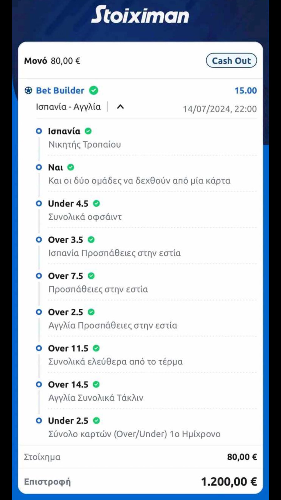 Ο τύπος, έριξε σε bet builder εννιά επιλογές. Από την κατάκτηση του τροπαίου, στις κάρτες και στα οφσάιντ, από εκεί στις προσπάθειες στην εστία (και των Ισπανών και των Άγγλων αλλά και συνολικά), στα ελεύθερα από το τέρμα, στα τάκλιν της Αγγλίας και τέλος, στις κάρτες του πρώτου ημιχρόνου!