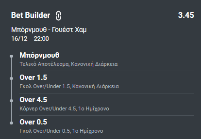 Στο σημερινό πρόγραμμα (Δευτέρα, 16/12), επιλέγουμε την αναμέτρηση της Μπόρνμουθ με τη Γουέστ Χαμ: