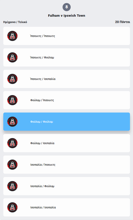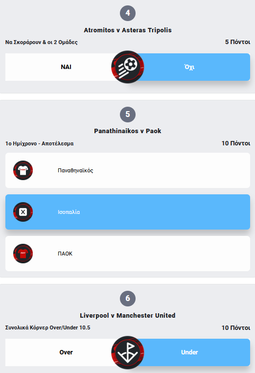 Προσοχή! Για να θεωρηθεί έγκυρη η συμμετοχή πρέπει να οριστικοποιηθεί πριν την έναρξη του πρώτου, χρονικά, αγώνα!