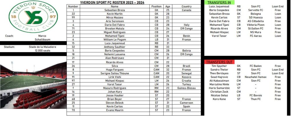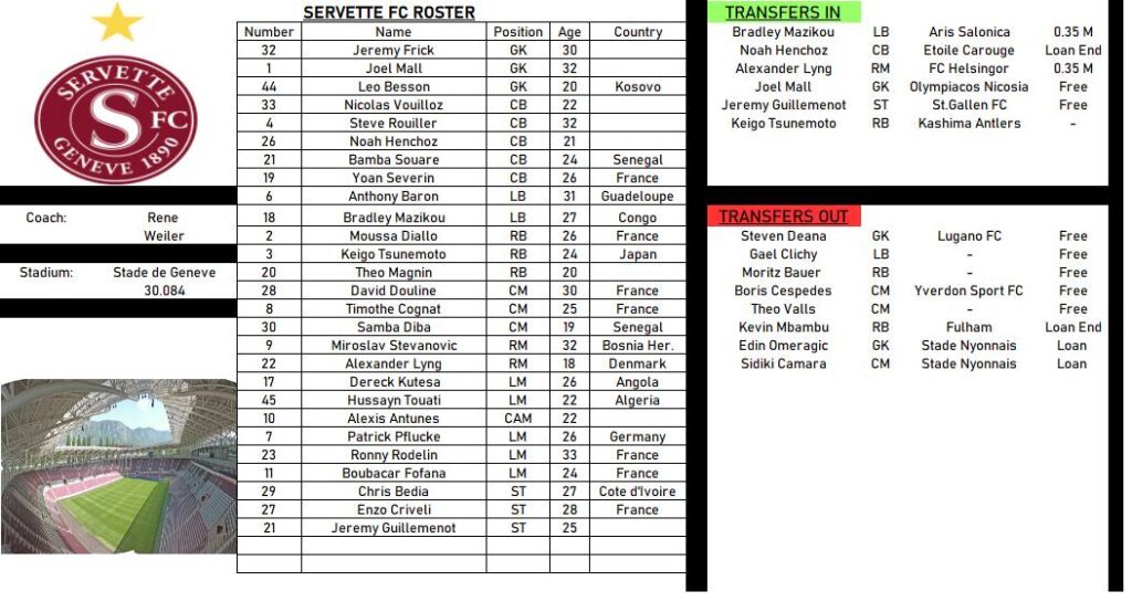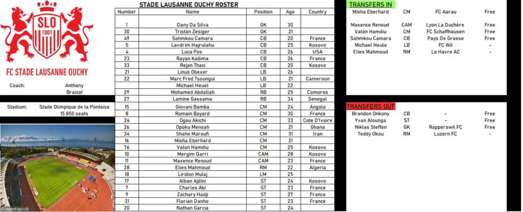 Ενισχύθηκε το καλοκαίρι πολύ στο επιθετικό κομμάτι με τις μεταγραφές που έκανε, με πιο ιδιαίτερη και δυνατή αυτήν του Teddy Okou, ο οποίος πέρσι ήταν καλύτερος παίκτες της Stade Lausanne Ouchy και της 2η κατηγορίας. Μάλιστα τον απέκτησε δύσκολα αφού τον ήθελαν όλες οι ομάδες της πεντάδας.