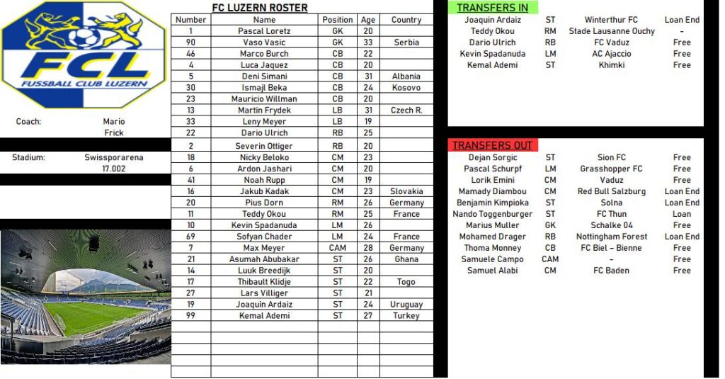 Θετικότατο πρόσημο και απόλυτη επιτυχία στους στόχους της για την Luzern FC πέρσι που τερμάτισε 4η, βγήκε μετά από καιρό στην Ευρώπη συμμετέχοντας τώρα στον 2ο προκριματικό του Conference League και είχε μια καλή ομάδα ιδιαίτερα επιθετικά με πολλά γκολ να πετυχαίνει. Ήταν μέτριο το ξεκίνημά της, ήταν στην περισσότερη διάρκεια του πρωταθλήματος στην μέση της βαθμολογίας αλλά όταν έφτανε η σεζόν στο τέλος ανέβασε και άλλο στροφές και πήρε δίκαια την 4η θέση. Πλέον στόχος της να μπει σε ευρωπαικούς ομίλους παιρνόντας από τα προκριματικά όπου η αλήθεια θα έχει δύσκολο έργο και να πάει εξίσου καλά στο ερχόμενο πρωτάθλημα τερματίζοντας τουλάχιστον στην πρώτη 5δα.