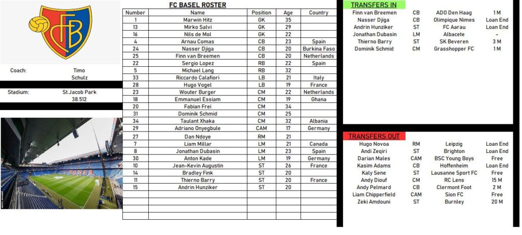Κάθε πέρσι και καλύτερη για την ομάδα της Βασιλείας η οποία τερμάτισε 5η στο πρωτάθλημα και οριακά πήρε το εισιτήριο για τα προκριματικά στην Ευρώπη. Πολύ ασταθής σε όλη την χρονιά, δεν αποτελούσε σε καμία περίπτωση την μεγάλη ομάδα των προηγούμενων ετών και απαγοήτευσε τους φιλάθλους της. Το μόνο θετικό η πορεία της πέρσι στα ημιτελικά του Conference League όπου έφτασε ως τα ημιτελικά και στις καθυστερήσεις έχασε την πρόκριση για τον τελικό του θεσμού.