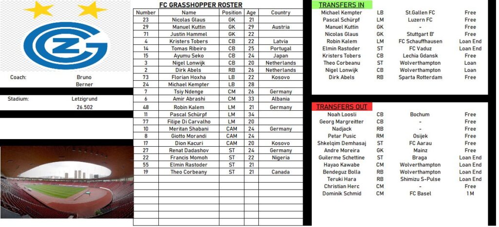 Φέτος θέλει να μπει ξανά δυναμικά στην διεκδίκηση της πρώτης τριάδας, το δήλωσε και πριν λίγες μέρες ο πρόεδρός της που βασίζεται στο γεγονός πως δεν θα έχει υποχρεώσεις στην Ευρώπη και ότι κράτησε το βασικό κορμό της ομάδας. Η αλήθεια έκανε λίγες προσεκτικές μεταγραφές, αντικατέστησε απλά 4 παίκτες που έφυγαν με άλλους τόσους που ήρθαν και ποντάρει στην συνοχή που θέλει να αποκτήσει μιας και είναι σχεδόν ίδια με πέρσι. Πιο καλή μεταγραφή φαίνεται αυτή του Arad Bar ο οποίος ήρθε για να αντικαταστήσει τον μέσο και εμβληματικό Dzemaili που σταμάτησε το ποδόσφαιρο.