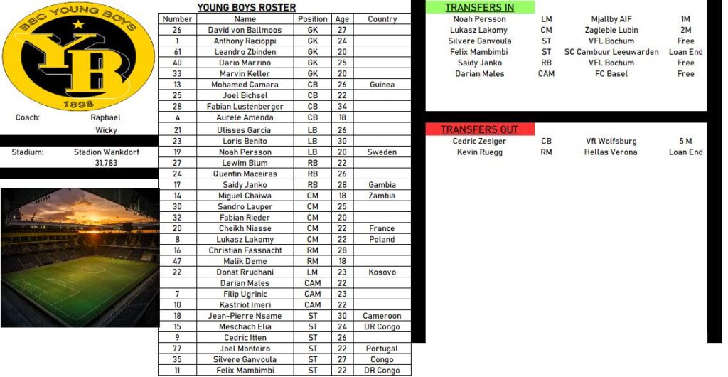 Προπονητής της και φέτος ο Ελβετός Wicky ο οποίος πέρσι διαχειρίστηκε άψογα το πλούσιο υλικό που είχε και πήρε τα πάντα. Έδρα της το καυτό πάντα Wankdorf που αποτελεί ακόμη ένα όπλο της.