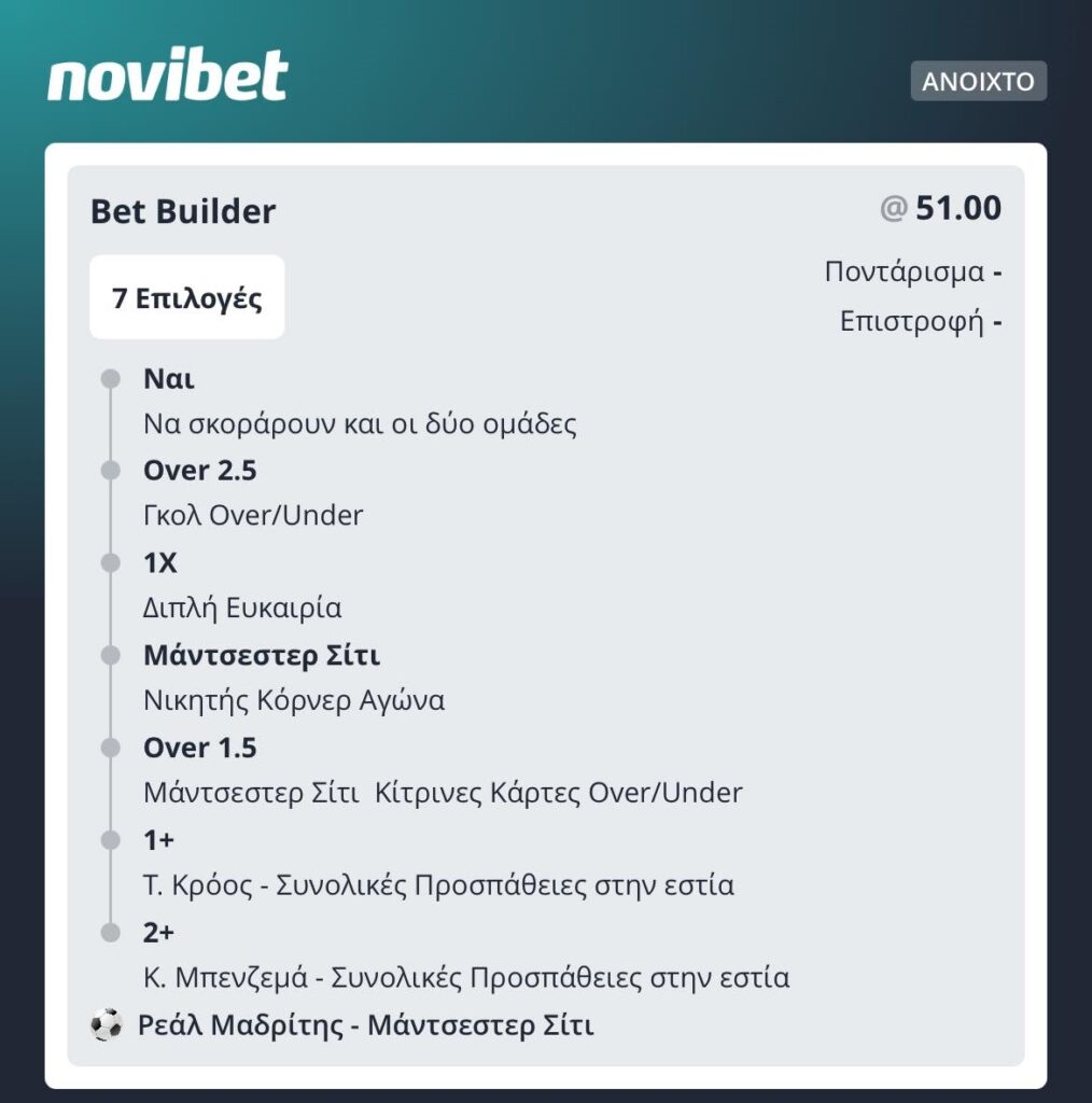 Από αυτήν εδώ τη στήλη, προσπαθούμε να βρούμε το καλύτερο bet builder της ημέρας, μέσα από την Novibet.