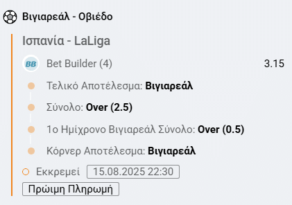 Στο σημερινό πρόγραμμα (Παρασκευή, 15/8), επιλέγουμε την αναμέτρηση της Βιγιαρεάλ με τη Ρεάλ Οβιέδο: