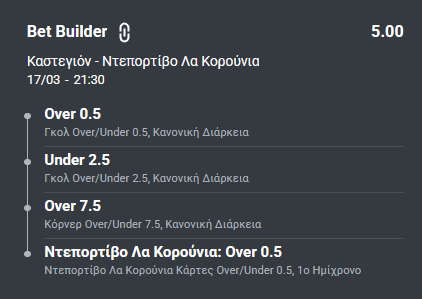 Στο σημερινό πρόγραμμα (Δευτέρα, 17/3), επιλέγουμε την αναμέτρηση της Καστεγιόν με τη Λα Κορούνια: