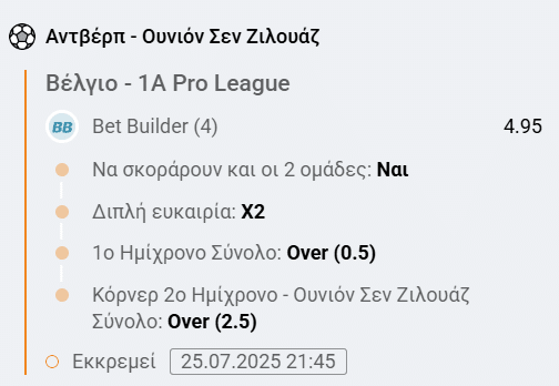 Στο σημερινό πρόγραμμα (Παρασκευή, 25/7), επιλέγουμε την αναμέτρηση της Αντβέρπ με την Ουνιόν Σεν Ζιλουάζ: