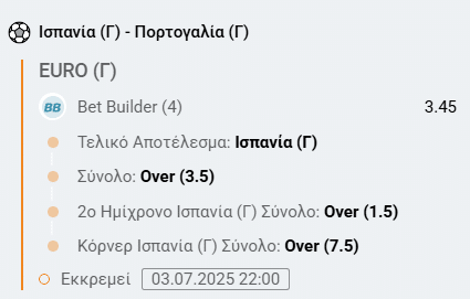 Στο σημερινό πρόγραμμα (Πέμπτη, 3/7), επιλέγουμε την αναμέτρηση της Ισπανίας (Γ) με την Πορτογαλία (Γ):
