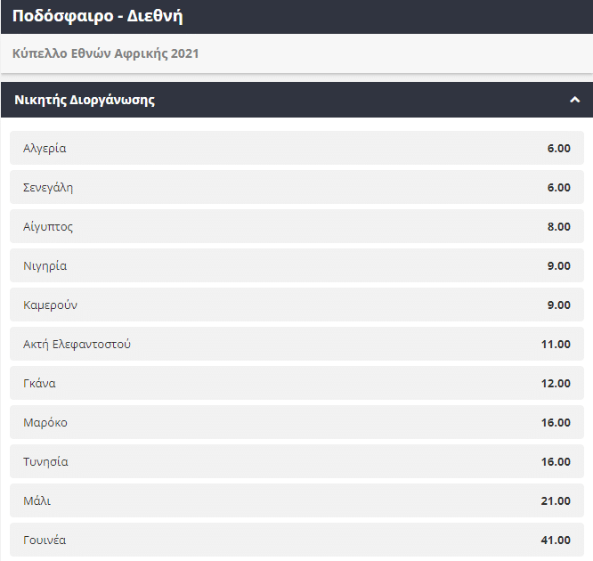 Εδώ μπορείτε να δείτε αναλυτικά τον πίνακα με τις πιθανές νικήτριες του Κυπέλλου Εθνών Αφρικής, σε συνδυασμό με τις αποδόσεις που τις ακολουθούν: