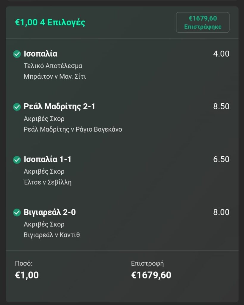 Ρεάλ Μαδρίτης – Ράγιο Βαγιεκάνο 2-1 στο 8.50, Έλτσε – Σεβίλλη 1-1 στο 6.50 και Βιγιαρεάλ – Κάντιθ 2-0 στο 8.00. Α! Ναι, και το χινάρι της Μπράιτον με τη Μάντσεστερ Σίτι στο 4.00.