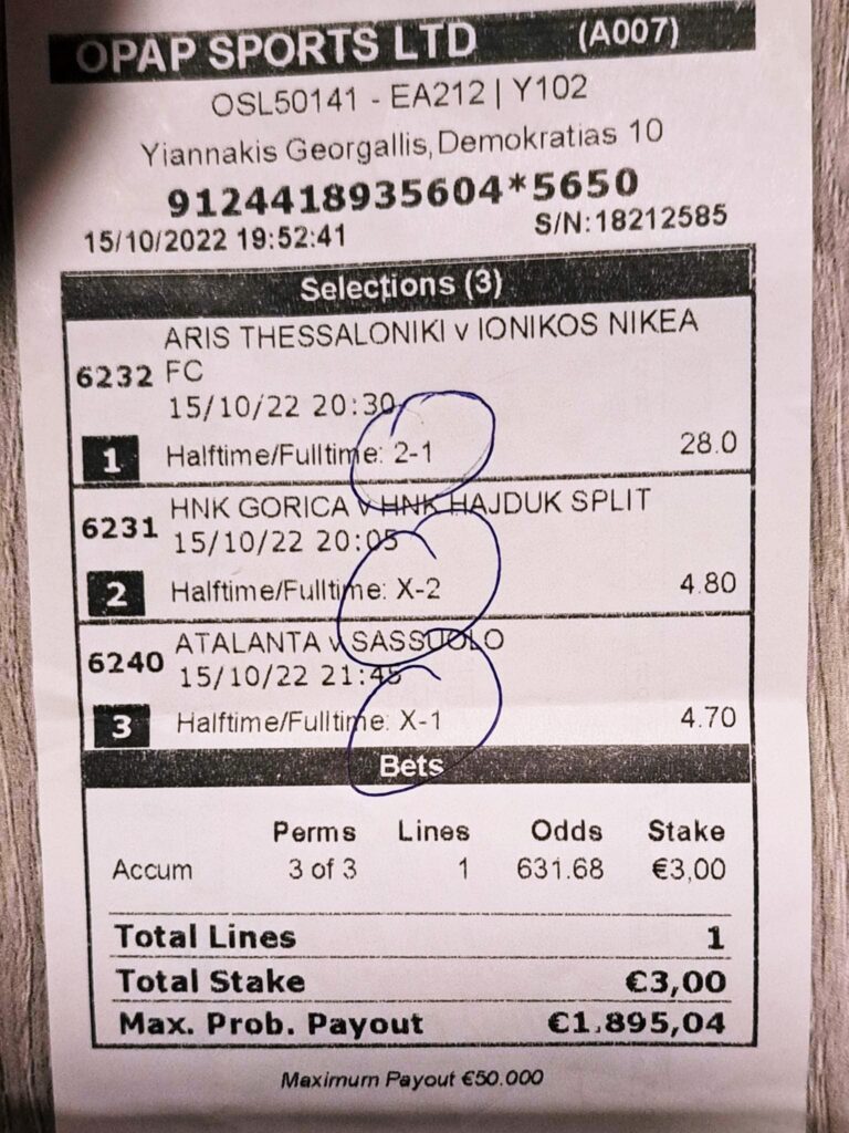 Όμως, δεν έμεινε εκεί. Οι δύο άλλες επιλογές, ήταν το Χ ημίχρονο, διπλό τελικό στο Γκόριτσα – Χάιντουκ Σπλιτ και το Χ ημίχρονο, άσο τελικό στο Αταλάντα – Σασουόλο. Στο 4.80 το πρώτο, στο 3.70 το δεύτερο.