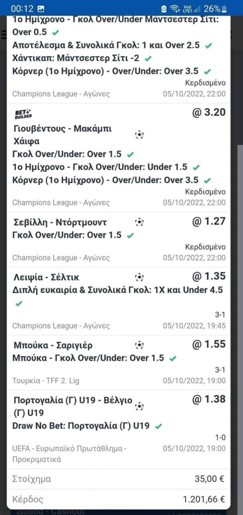 Συνολική απόδοση του δελτίου; Κοντά στο 35.00. Ποντάρισμα; Ευρώ 35. Κέρδος; Ευρώ 1.200! Τρομερός ο παικταράς!