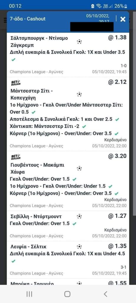 Και μετά, αρχίζουν τα καλά με σεντονάτες επιλογές. Στα δύο ματς του Champions League που ξεκινούσαν στις 19:45 έπαιξε 1Χ & Under 4,5 στο 1.35 τη Λειψία με τη Σέλτικ (3-1) και 1Χ & Under 4,5 στο 1.38 τη Σάλτσμπουργκ με την Ντιναμό Κιέβου (1-0).