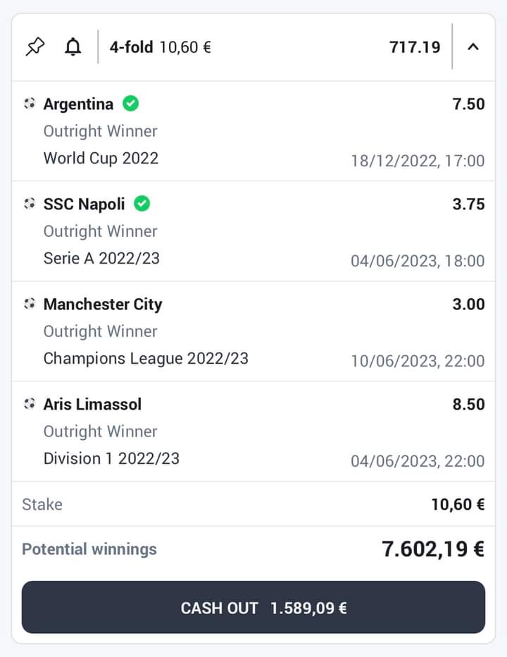 Η Αργεντινή, το σήκωσε το Μουντιάλ. Στο 7.50 το είχε πάρει ο φίλος. Η Νάπολι, όπου να ‘ναι τη σηκώνει τη Serie A, όμως με την τεράστια διαφορά από τη δεύτερη Λάτσιο, το 3.75 έχει πληρωθεί ήδη.