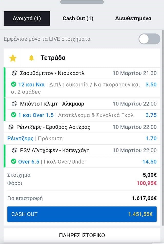 Ο υπερτυχερός έπαιξε ένα δελτίο με 4 επιλογές, στοιχηματίζοντας το ποσό των 5 ευρώ! Συγκεκριμένα κέρδισε στα παιχνίδια Σαουθάμπτον-Νιουκαστλ (3.50), Μπόντο Γκλίμτ-Άλκμααρ (3.75), Αιντχόφεν-Κοπεγχάγη (14.50), Ρέιντζερς – Ερυθρός Αστέρας πρόκριση Ρέιντζερς με τον Αγώνα να τελειώνει 3-0 (1.70) πραγματοποιώντας cash out στο ποσό των 1451€.