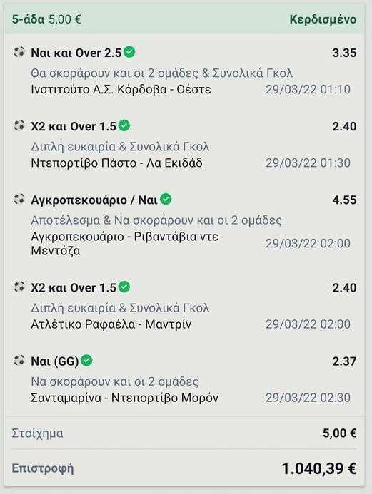Ο Μεγάλος τυχερός έπαιξε ένα δελτίο με 5 επιλογές ! Συγκεκριμένα κέρδισε στα Πρωταθλήματα Αργεντινής & Κολομβίας πεντάδα σε συνολική απόδοση 208.00 κερδίζοντας το ποσό των 1.040 €.
