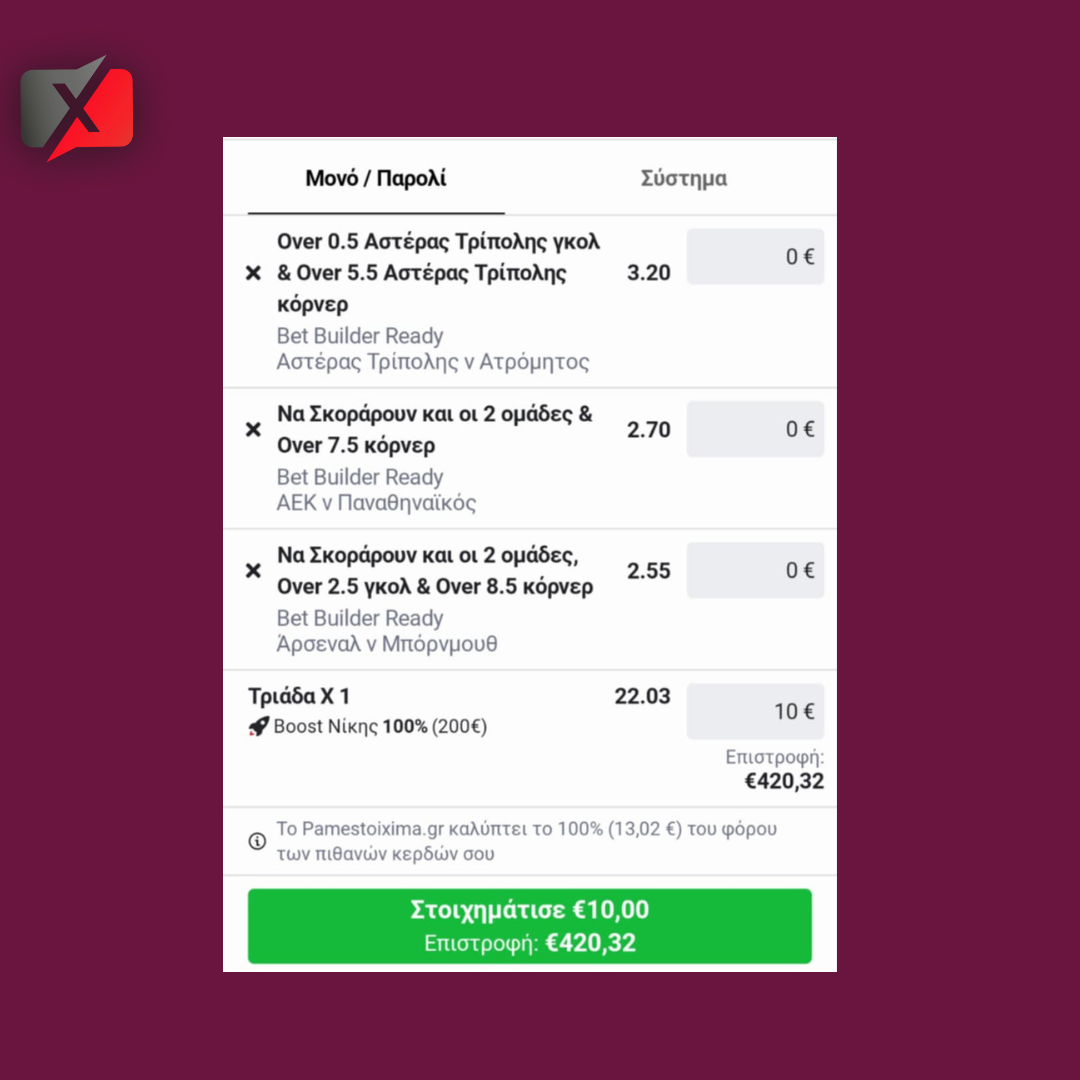Το παρολί με τις τρεις επιλογές σε ενισχυμένα Bet Builder Ready* από το μενού του ΣαββατοΚύριακου από τα μεγάλα Ευρωπαϊκά πρωταθλήματα δίνει σούπερ boostarisma 100% και η απόδοση από 22.03 ανεβαίνει στο 42.03, με αποτέλεσμα τα κέρδη να είναι 420.32€ σε πιθανό ποντάρισμα 10€.