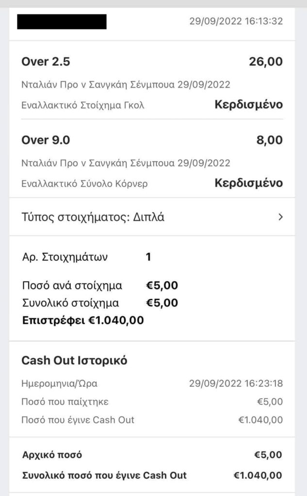 Λίγο μετά το 80’ της αναμέτρησης και με το σκορ στο 1-0, ο παικταράς πόνταρε στο over 2,5 σε απόδοση 26.00 αλλά και στα over 9 κόρνερ (σε απόδοση 8.00) που εκείνη την ώρα ήταν έξι! Συνολική απόδοση 208.00!