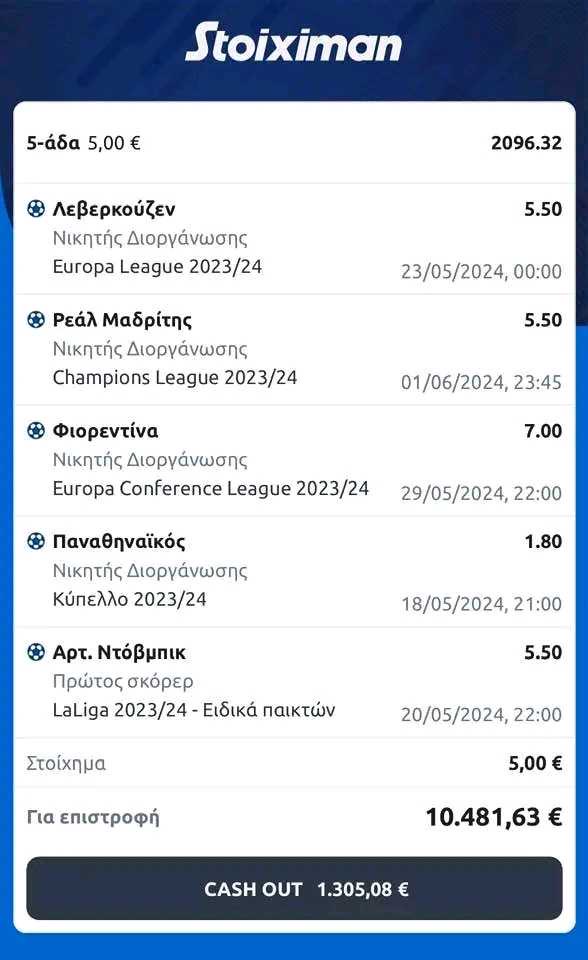 Η επένδυσή του, ήταν μόλις ένα τίμιο ταλιράκι. Η απόδοση του δελτίου, άγγιξε το 2.100. Τα πιθανά κέρδη είναι σχεδόν στα 10.500 ευρώ. Το cash out αυτή τη στιγμή που μιλάμε ανέρχεται στα 1.305.