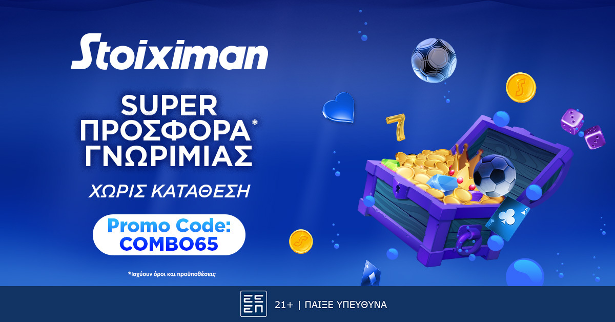 Κάνοντας την εγγραφή σου για πρώτη φορά στη Stoiximan και χρησιμοποιώντας τον κωδικό COMBO65, θα κάνεις δικά σου τα 65 δώρα* γνωριμίας, αυτόματα και χωρίς κατάθεση*, ώστε να απολαύσεις το παιχνίδι σου σε στοίχημα & live casino.