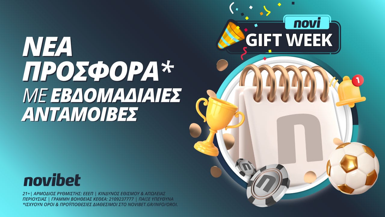 Ο λόγος για την Novi Gift Week* που βρίσκεται στον… αέρα και θα είναι διαθέσιμη έως και την 31η Ιουλίου 2022. Πρόκειται για μία προσφορά «7 στα 7»*, κοντολογίς υπάρχει ένα δώρο* την ημέρα για μία εβδομάδα στην πλατφόρμα της Novibet.