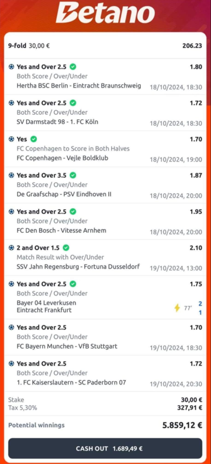 Αυτό συνέβη στον φίλο μας! Το λοιπόν. Είχε παίξει στις 18 του Οκτώβρη την τίμια… εννιάδα του. Με πέντε ματσάκια της Παρασκευής και τέσσερα του Σαββάτου. Ναι, εννιά ματσάκια. Όλα στα γκολ, εκτός από τη Φορτούνα Ντίσελοντορφ. Αυτή την ήθελε στο διπλό με Over 1,5 στη Ρέγκενσμπουργκ και την έπιασε.