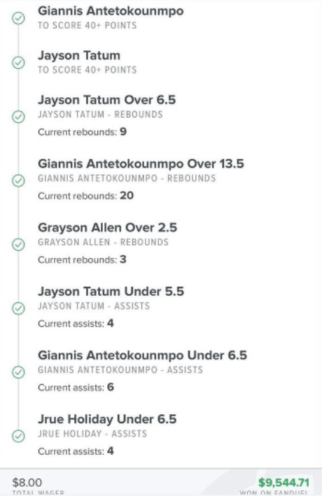 Πρώτος και καλύτερος στο δελτίο του ο Αντετοκούνμπο. Ήθελε 40+ πόντους, over 13,5 ριμπάουντ και under 6,5 ασίστ. Φυσικά, ο Giannis τον δικαίωσε σε όλες τις κατηγορίες των στατιστικών του!