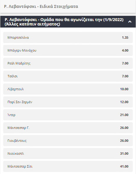Οι «μπλαουγκράνα», οι οποίοι βρίσκονται σε φάση ανανέωσης και ανοικοδόμησης υπό τον Τσάβι, φαντάζουν το πρώτο φαβορί για την επόμενη ομάδα του Λέβα με την απόδοση να μην ξεπερνά το 1.40 Πιθανό, σύμφωνα με τους μπουκ το ενδεχόμενο παραμονής του στο Μόναχο, καθώς προσφέρεται δεύτερο φαβορί στο 4.00.