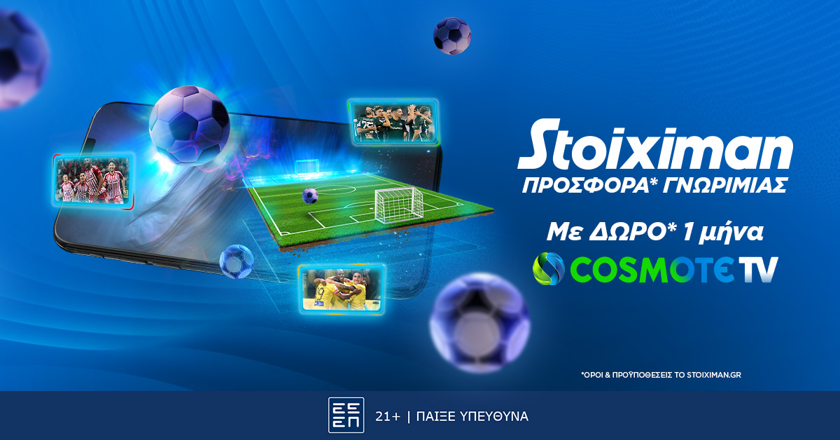 Aν θες όλα τα παραπάνω, δεν έχεις παρά να χρησιμοποιήσεις τον κωδικό “COSMOTETV” στην σούπερ προσφορά* γνωριμίας της Stoiximan!