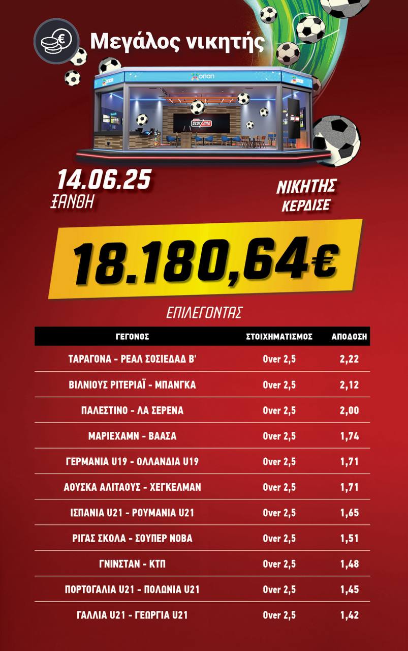 Και το κατάφερε σε όλα. Παντού μπήκαν τουλάχιστον τρία γκολ και το δελτίο του με απόδοση 363,61 του γύρισε 18.180,64 ζεστά ευρώπουλα! Κάπως έτσι, βγήκαν όχι μόνο οι διακοπές του Αυγούστου, αλλά κι αυτές των Χριστουγέννων, του Πάσχα και του επόμενου καλοκαιριού! Πιθανότατα θα του μείνουν και ρέστα!