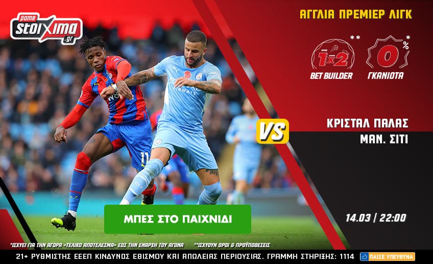 Από εκεί και πέρα, στο ποδοσφαιρικό πρόγραμμα της Δευτέρας (14/03) κλέβει την παράσταση η δοκιμασία της Μάντσεστερ Σίτι στην έδρα της Κρίσταλ Πάλας. Ακόμα ένα παιχνίδι της Premier League που ζεις στο Pamestoixima.gr με 0% γκανιότα** και πολλά special bets στις αποδόσεις που πάντα ήθελες!
