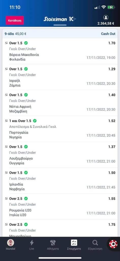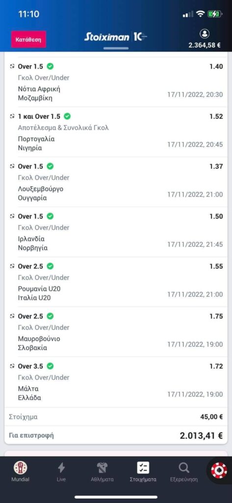 Τι έπαιξε όμως; Τα απλά ήταν τα over 1,5 σε Νότια Αφρική – Μοζαμβίκη, Λουξεμβούργο – Ουγγαρία, Ιρλανδία – Νορβηγία. Αύξησε λίγο το ρίσκο παίζοντας over 2,5 στα Ρουμανία U20 – Ιταλία U20 και Μαυροβούνιο – Σλοβακία, όμως ούτε εκεί είχε πρόβλημα.