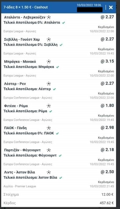 Ο συγκεκριμένος παίχτης προτίμησε την επιλογή του cash out όπως θα δείτε παρακάτω (κάλλιο πέντε και στο χέρι παρά δέκα και καρτέρει) χαρίζοντας πάνω απο 8.000€ με αυτό τον τρόπο βλέποντας το δελτίο του να επαληθεύεται στο απόλυτο.