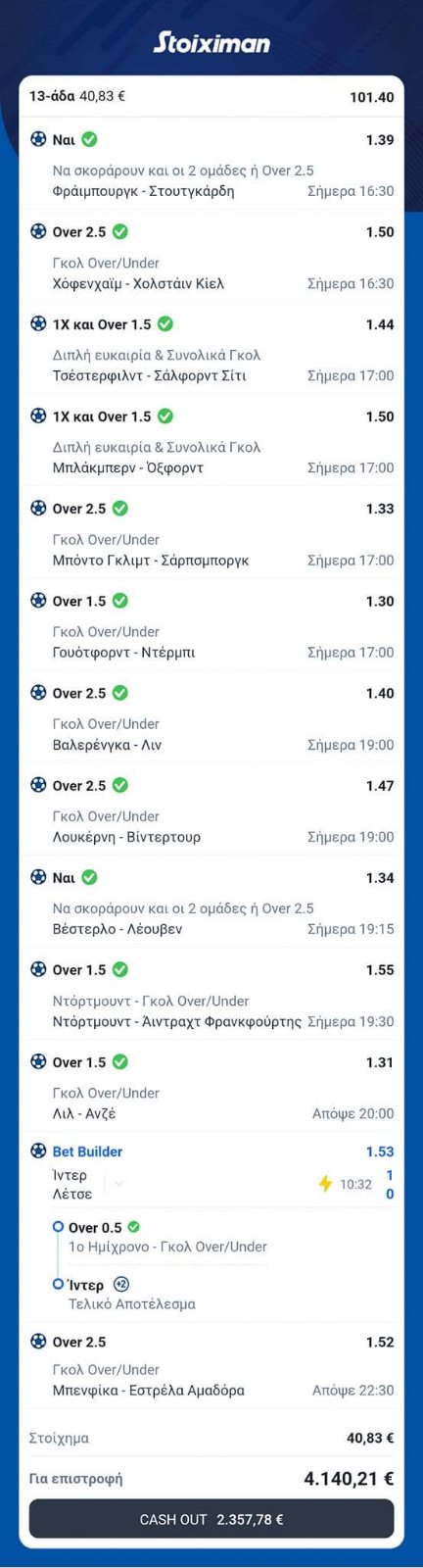 Με το που σκόραρε η Ίντερ στο πρώτο δεκάλεπτο, και με το πορτογαλικό να μην έχει ξεκινήσει ακόμα, ο τύπος πάτησε το μαγικό κουμπάκι του cash out και πήρε τα 2.357 ευρώπουλα που του έδινε εκείνη τη στιγμή, από τα πιθανά 4.100!