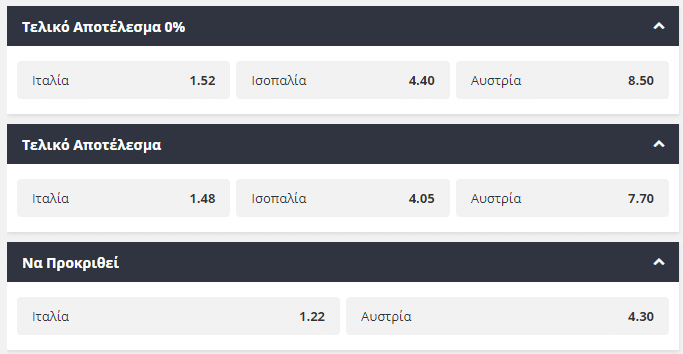 Μία από τις ευχάριστες εκπλήξεις του ευρωπαϊκού πρωταθλήματος είναι η Ιταλία, που μέχρι στιγμής έχει αποδώσει το πιο εντυπωσιακό και αποτελεσματικό ποδόσφαιρο στην διοργάνωση. Έχει το πρώτο λόγο για τη νίκη και την πρόκριση στα προημιτελικά απέναντι στην Αυστρία, που τερμάτισε στην δεύτερη θέση του ομίλου της πίσω από την Ολλανδία. Η νίκη της «σκουάντρα ατζούρα» βρίσκεται στο 1,52 και έχει πτωτικές τάσεις, ενώ η απλή πρόκριση προσφέρεται σε τοκογλυφικές τιμές κοντά στο 1,22. Η Αυστρία θα παλέψει για την έκπληξη, αλλά η πορεία της μέχρι στιγμής η διοργάνωση αφού ξεπέρασε τον Σκόπελο των ομίλων κρίνεται άκρως ικανοποιητική. Στο 4.30 βρίσκεται η πρόκριση των Αυστριακών για όσους θελήσουν να την επιλέξουν.