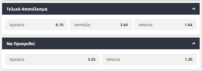 Δεν εντυπωσίασε στην φάση των ομίλων η Κροατία, αλλά με την εξαιρετική της εμφάνιση στο τελευταίο ματς του ομίλου απέναντι στη Σκωτία πήρε τη νίκη και προκρίθηκε ως δεύτερη του τετάρτου ομίλου στην φάση των «16» του Ευρωπαϊκού Πρωταθλήματος. Απέναντί της θα βρεθεί η Ισπανία, που και αυτή δυσκολεύτηκε να πάρει την πρόκριση στην επόμενη φάση. Σκληρή μάχη αναμένεται από τις δύο ομάδες, που έχουν τόσο ταλέντο όσο και εμπειρία στο ρόστερ τους και η ομάδα που θα φανεί πιο ψύχραιμη και αποτελεσματική, θα είναι και αυτή που θα πάρει την πρόκριση. Μόλις στο 1.30 προσφέρετε η πρόκριση για τους Ισπανούς, ενώ στο 6,10 προσφέρει την καθαρή νίκη της Κροατίας στα 90 λεπτά του αγώνα.