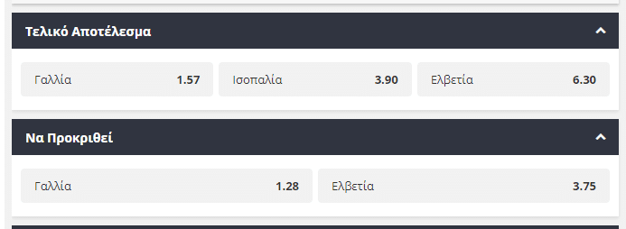 Αναμέτρηση με καθαρό φαβορί στο Βουκουρέστι, με την Γαλλία να υποδέχεται την Ελβετία. Οι Γάλλοι ξεκίνησαν τον τουρνουά ως το μεγάλο φαβορί για να φτάσουν μέχρι την κατάκτηση του και μέχρι στιγμής με την εικόνα τους έχουν επιβεβαιώσει αυτόν τον τίτλο. Απέναντί τους θα βρεθεί η Ελβετία, που παρουσίασε πολλά σκαμπανεβάσματα στα τρία πρώτα παιχνίδια του ομίλου, αλλά κατάφερε τουλάχιστον να εξασφαλίσει την πρόκριση της μέχρι την φάση των «16». Στο 1,57 προσφέρεται η νίκη των Γάλλων στην κανονική διάρκεια του αγώνα, ενώ μόλις στο 1,28 προσφέρεται η πρόκριση τους στα προημιτελικά.