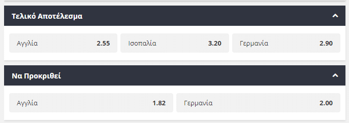 Το μεγάλο ντέρμπι της φάσης των «16» του Ευρωπαϊκού Πρωταθλήματος θα διεξαχθεί στο «Wembley» της Αγγλίας, με την ομώνυμη ομάδα να αντιμετωπίζει την Γερμανία, σε ένα ματς που όλα είναι πιθανά. Τα «λιοντάρια» δεν έχουν καταφέρει ποτέ μέχρι στιγμής να φτάσουν μέχρι την κατάκτηση του τροπαίου και με την δύναμη της έδρας ευελπιστούν να το καταφέρουν την φετινή σεζόν. Στον αντίποδα, η Γερμανία δεν εντυπωσίασε με τις εμφανίσεις της στον όμιλο της φωτιάς, αλλά παραμένει μία ποιοτική και επικίνδυνη ομάδα με μεγάλη εμπειρία και κρύο αίμα στις μεγάλες διοργανώσεις. Όπως αναμενόταν και από τους μπουκ, οι αποδόσεις είναι μοιρασμένες με την Αγγλία (1.82) να έχει ελαφρύ προβάδισμα πρόκρισης έναντι της Γερμανίας (2.00). Πιθανή και ισοπαλία στο συγκεκριμένο ζευγάρι που προσφέρεται στο 3.20.