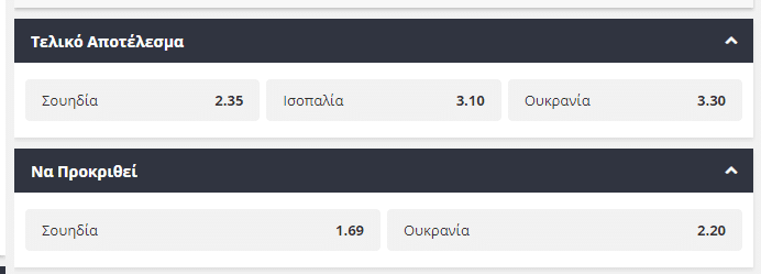 Το ζευγάρι που θα ολοκληρώσει το παζλ των προημιτελικών είναι αυτό ανάμεσα στη Σουηδία και την Ουκρανία. Τόσο οι Σουηδοί όσο και οι Ουκρανοί, είχαν και τις καλές και τις κακές τους στιγμές στην φάση των ομίλων, αλλά αμφότερες κατάφεραν να εξασφαλίσουν την πρόκριση και να βρεθούν ένα ματς μακριά από τους «8» της διοργάνωσης. Αμφότερες διαθέτουν ταλαντούχους ποδοσφαιριστές στα ρόστερ τους και η πρόκριση θα κριθεί στο όριο. Οι μπουν δίνουν ένα μικρό προβάδισμα στην Σουηδία, που προσφέρεται στο 1,69, τη στιγμή που η Ουκρανία προσφέρεται στο 2,20.